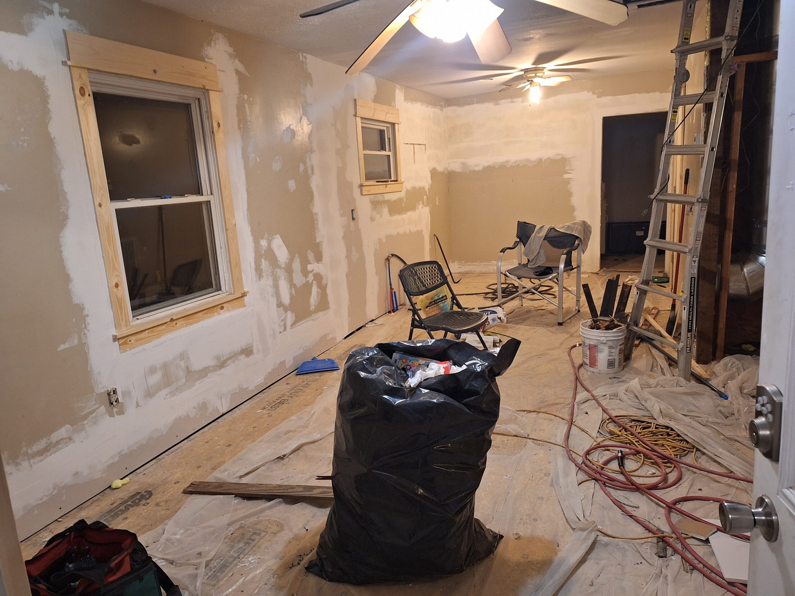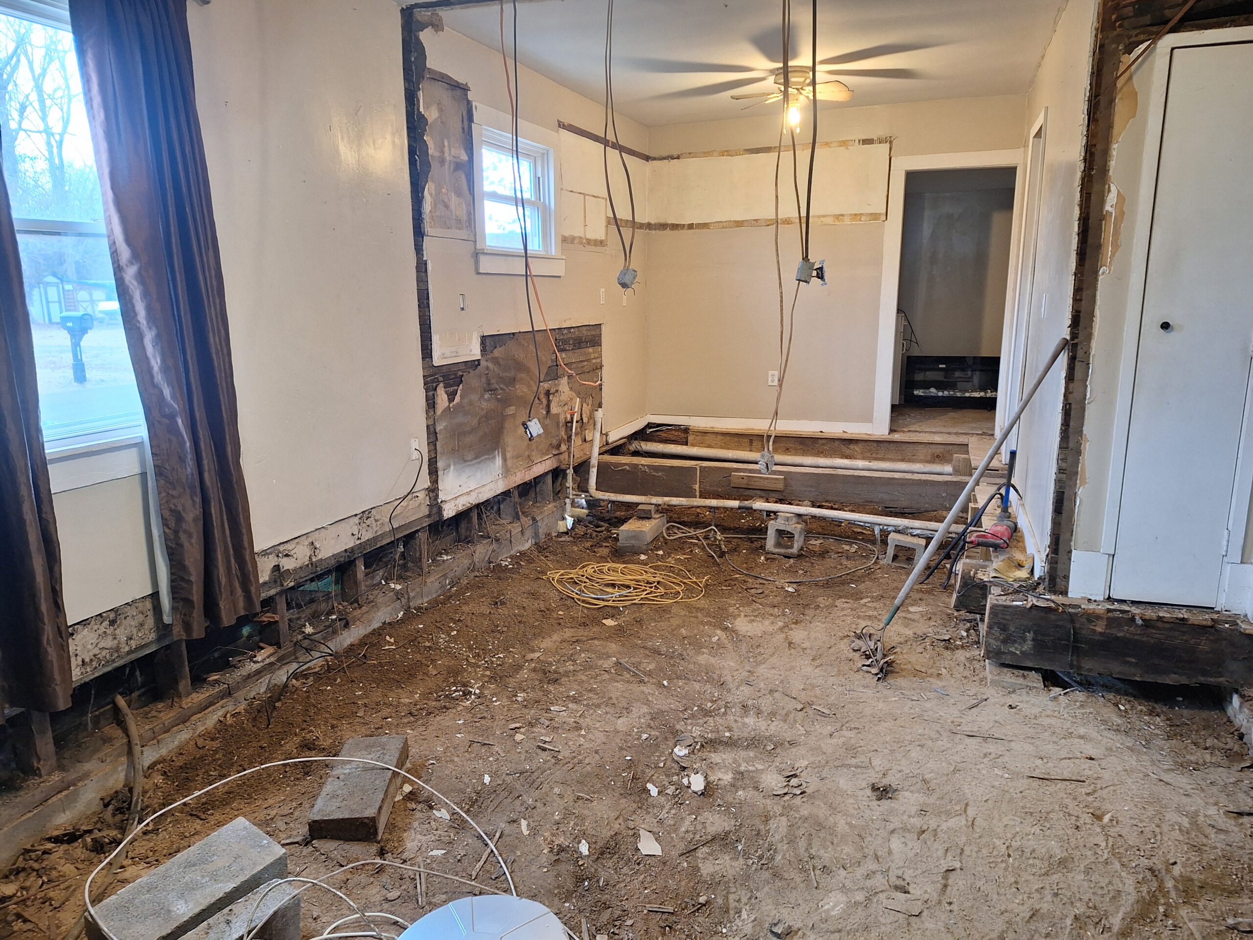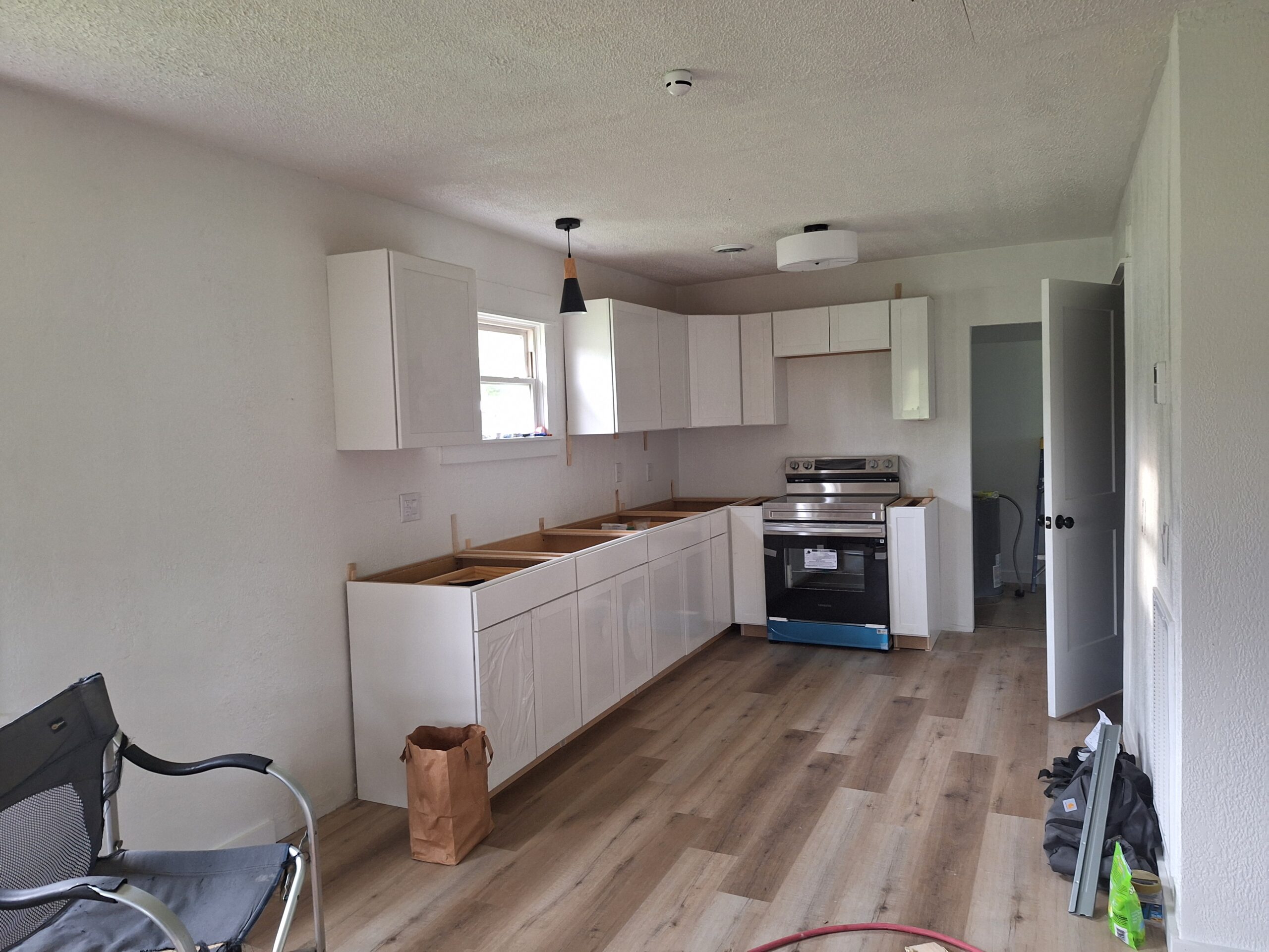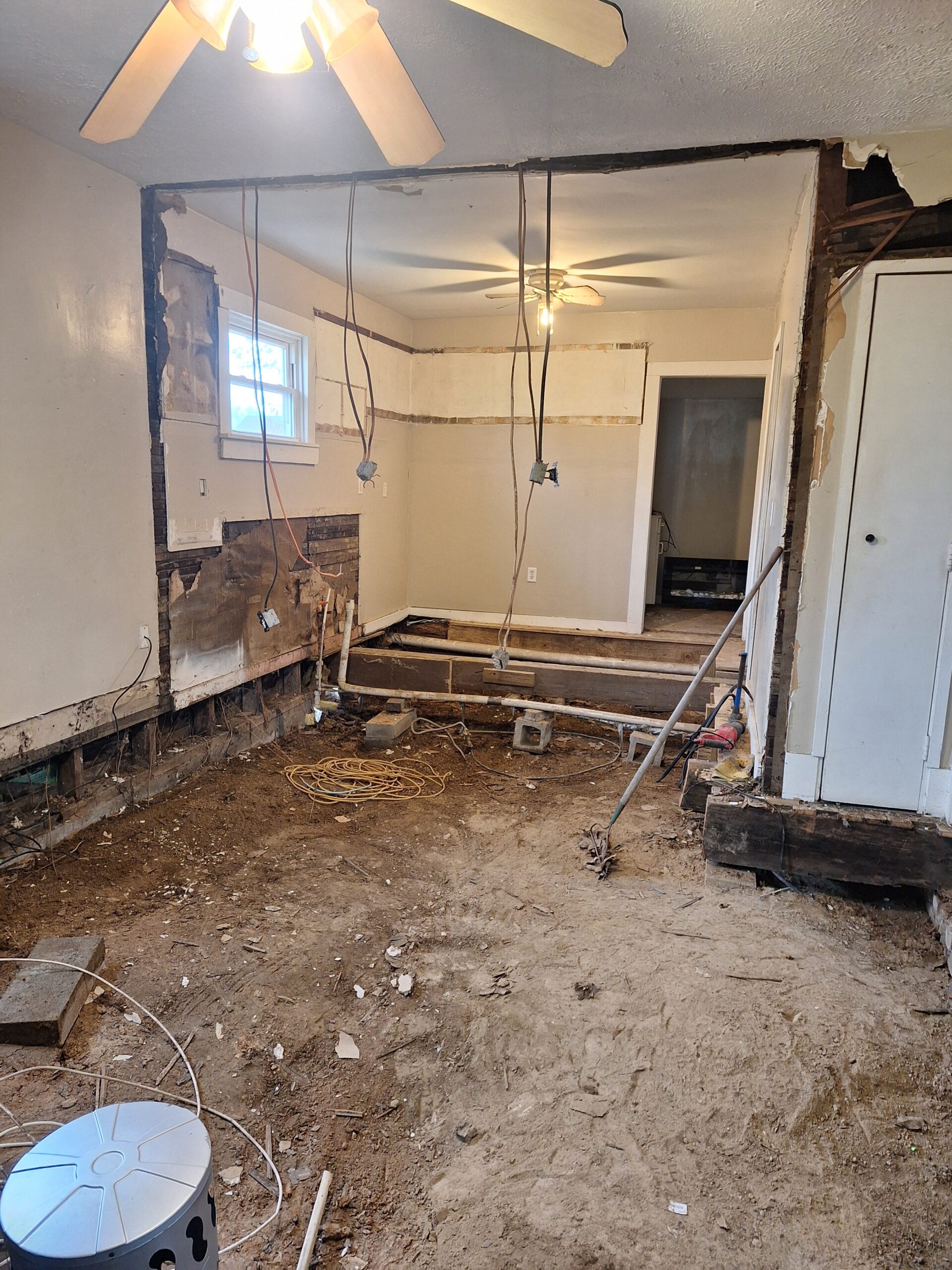 This is a small rental house we remodeled. The entire floor system was rotten and had to be replaced. We added a vapor barrier, had all new PEX plumbing installed, and built a new floor. We removed a dividing wall in the kitchen/living area, making it a more functional space. We added a MrCool VersaPro HVAC system with separate ducts in each room. There was also a carport roof on the garage that was dangerously rotten and on the verge of collapsing, so we removed it and repaired the damaged soffit and fascia. We plan on replacing the garage roof shingles next year.