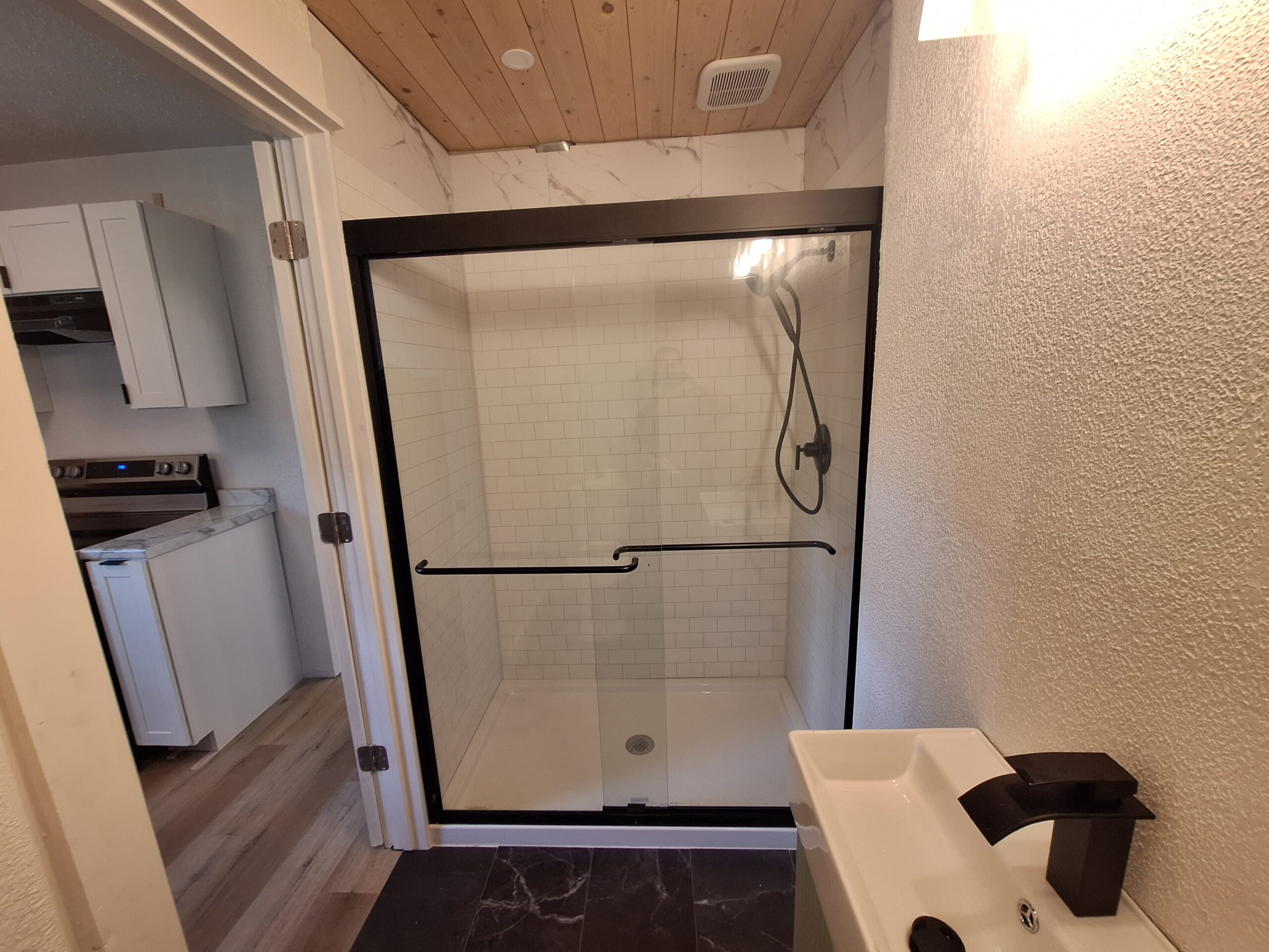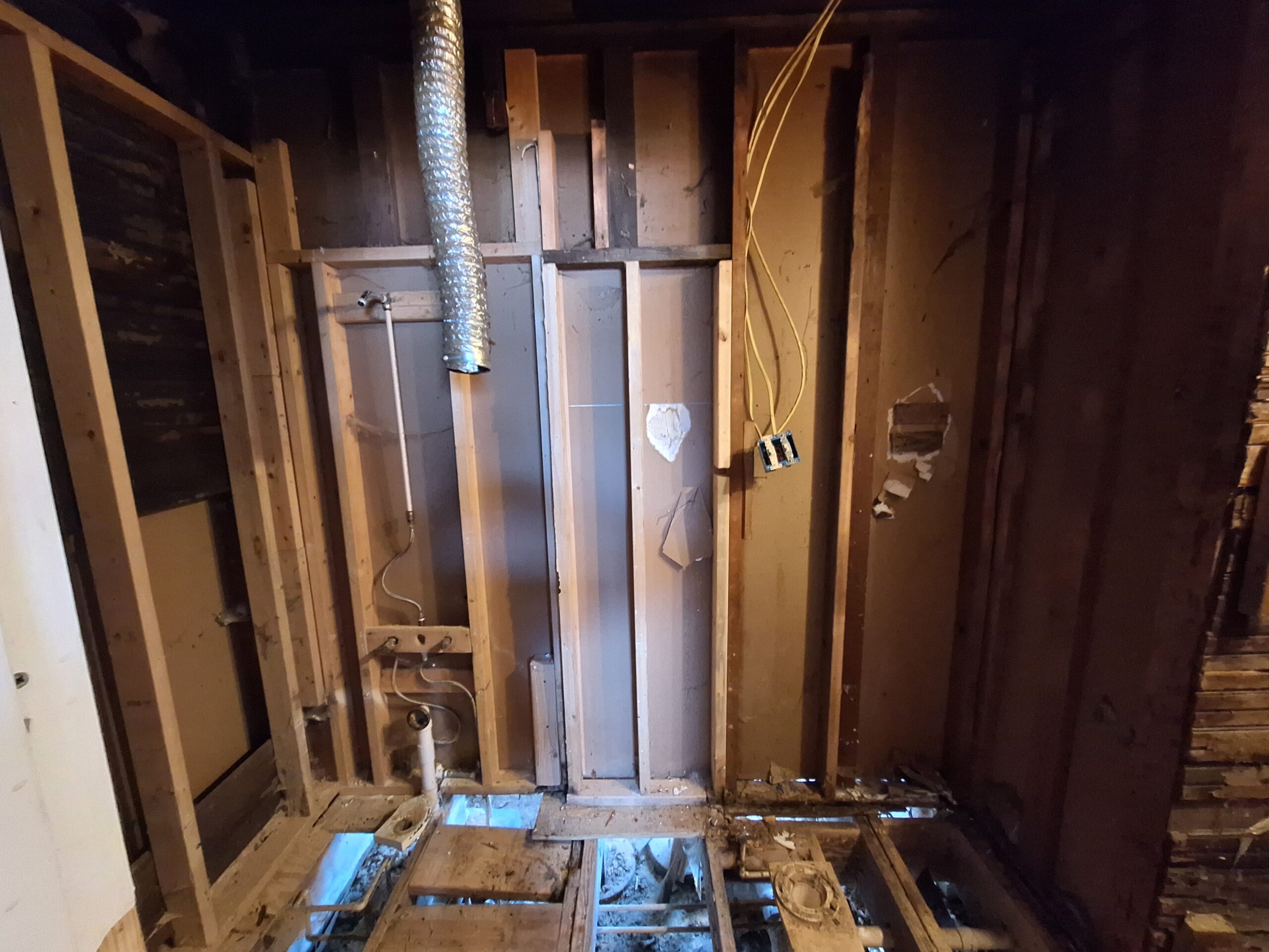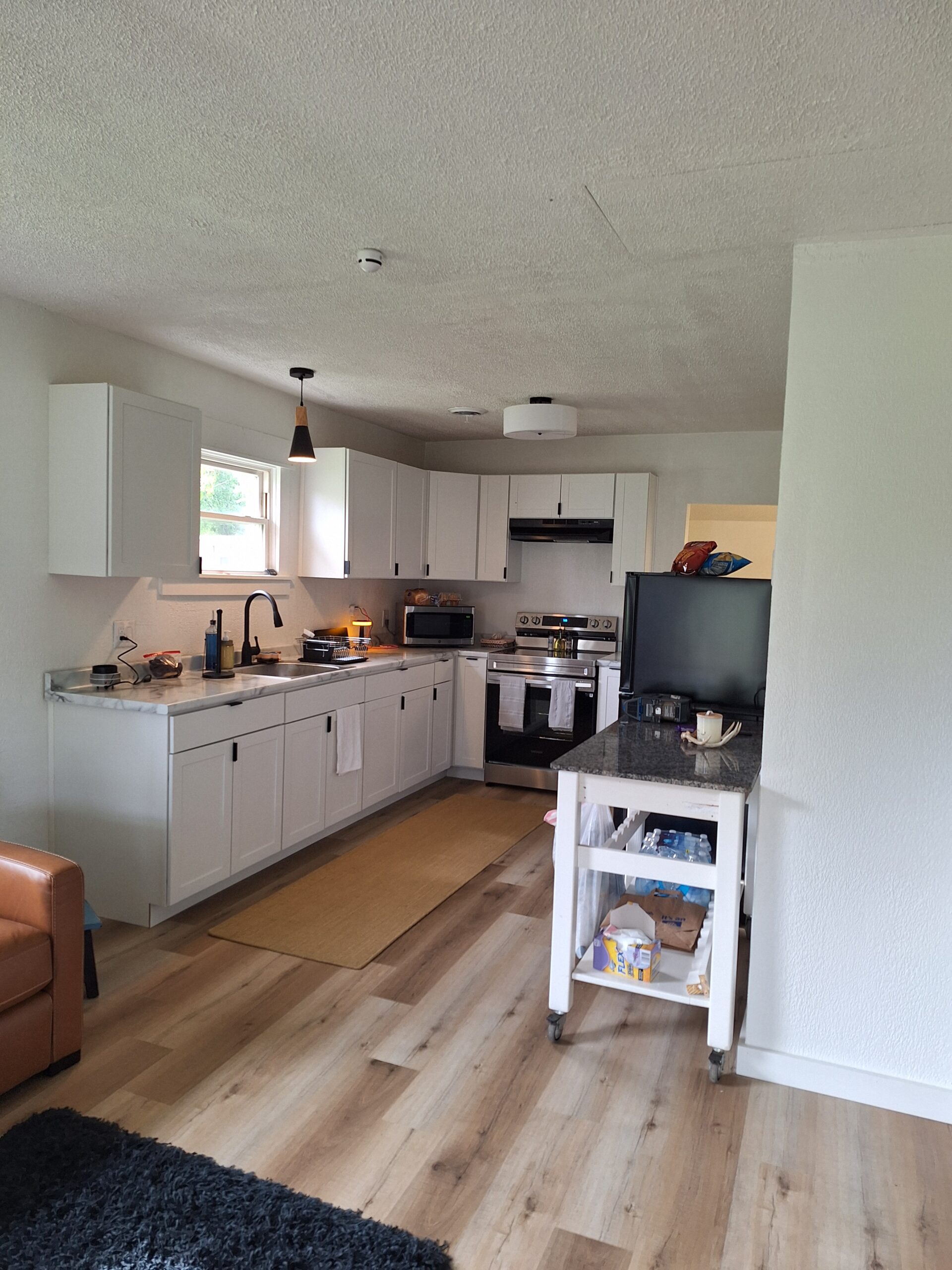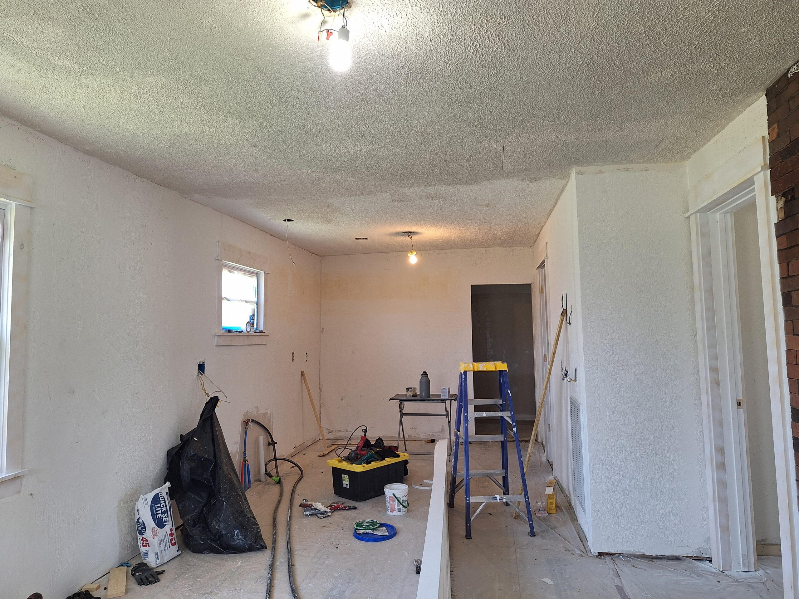 This is a small rental house we remodeled. The entire floor system was rotten and had to be replaced. We added a vapor barrier, had all new PEX plumbing installed, and built a new floor. We removed a dividing wall in the kitchen/living area, making it a more functional space. We added a MrCool VersaPro HVAC system with separate ducts in each room. There was also a carport roof on the garage that was dangerously rotten and on the verge of collapsing, so we removed it and repaired the damaged soffit and fascia. We plan on replacing the garage roof shingles next year.